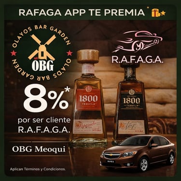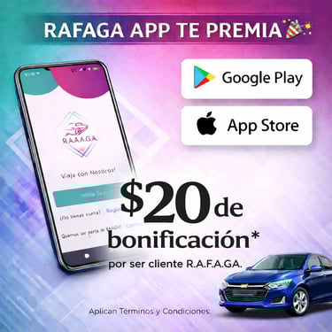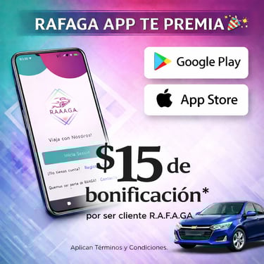 Asimismo, R.A.F.A.G.A. se reserva el derecho de suspender temporalmente o eliminar de manera definitiva la cuenta de cualquier usuario que incurra en un uso indebido de la aplicación, del sistema de cupones o de cualquiera de sus funcionalidades, incluyendo, de manera enunciativa mas no limitativa, la generación de viajes falsos, simulados, manipulados o cualquier otra conducta destinada a obtener beneficios de forma fraudulenta. Dichas acciones podrán ser sancionadas sin previo aviso y no darán lugar a reembolso, compensación o reinstalación de beneficios previamente obtenidos.